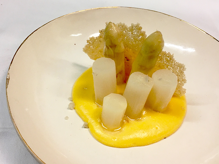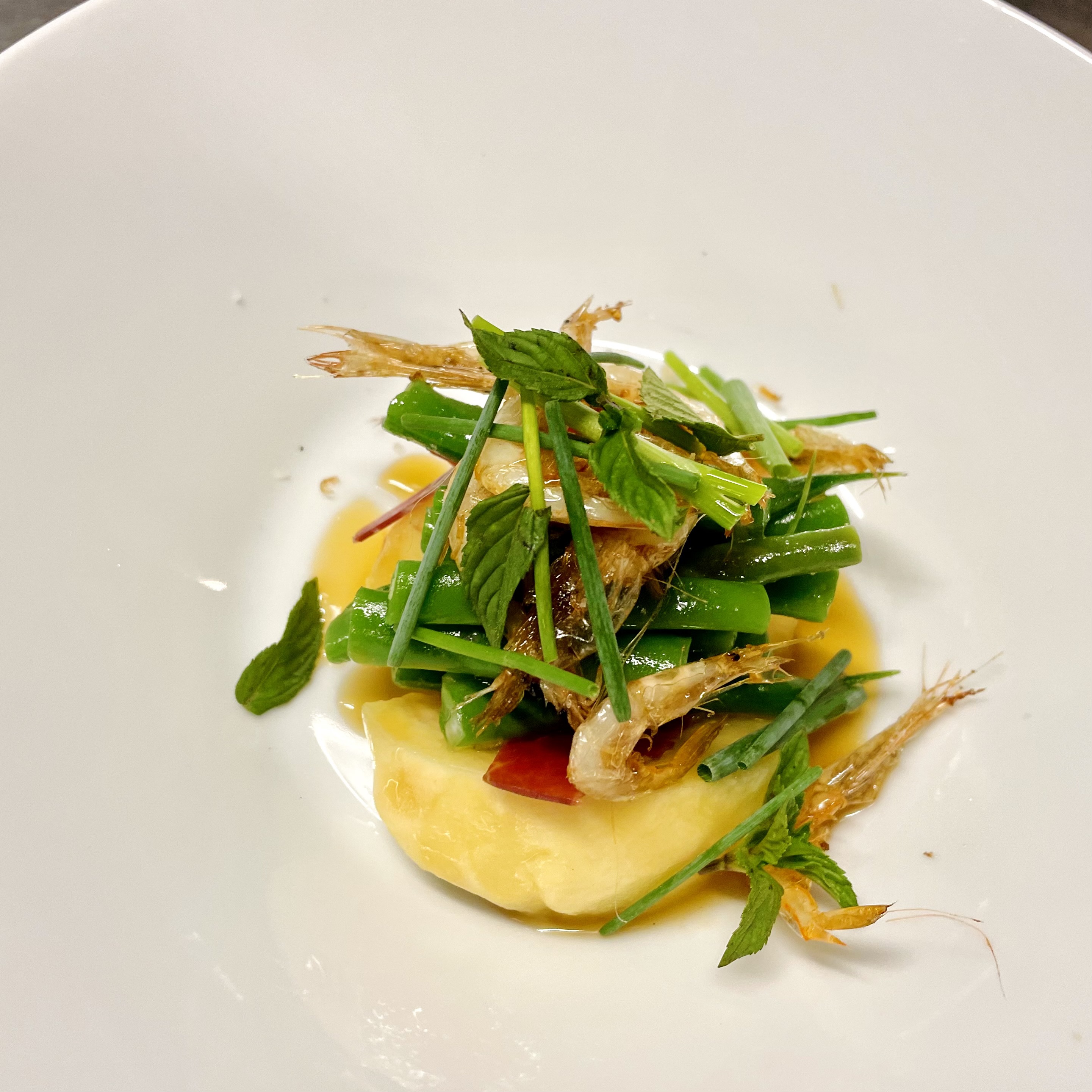 *海老のブイヨンとホワイトアスパラ 白海老のフリット