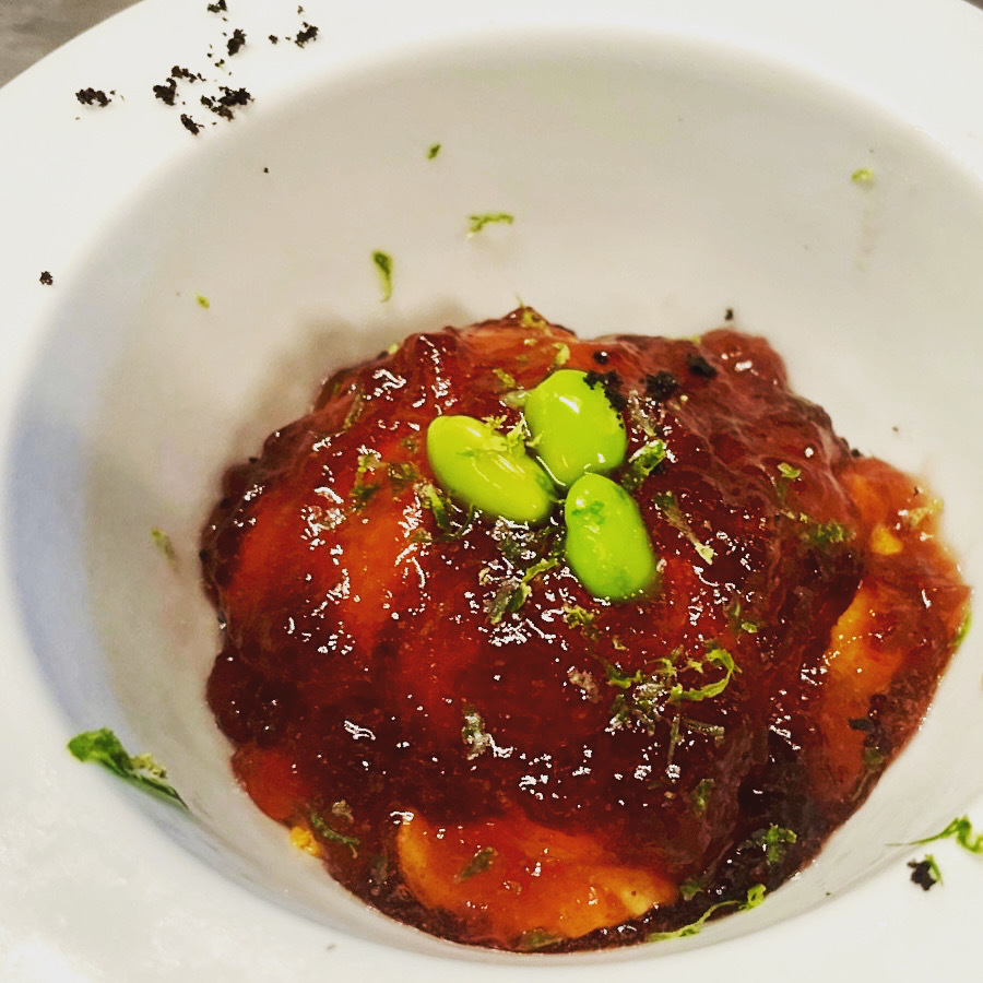 *ウニとトマトのソルベ 茄子の煮浸し コンソメジュレがけ ライム風味